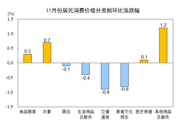 11月份,全国居民消费价格环比下降0.1%。其中,城市下降0.1%,农村持平;食品价格上涨0.5%,非食品价格下降0.2%;消费品价格上涨0.1%,服务价格下降0.4%。